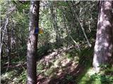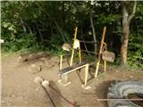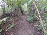 Behind the bar Krpin, which is situated by the parking lot there starts a well-beaten path which leads towards the church of St. Peter on Gora. The path at first runs on a gentle cart track, and then passes on the right side of the ski slope, where it is ascending by the edge of the forest. Further, we are for some time relatively steeply ascending, and then the path after the shepherd hut for some time flattens a little. A little further, on the upper part of the ski slope, where normal path turns right, we continue left in the direction of the path over the climbing wall. Next follows some traversing, at first still with nice views, and after the bench Mancina klopca path passes into the forest. In the forest, we continue on the left path (right path avoids the climbing wall and technically it isn't demanding) and in a gentle diagonal descent we descend to the foot of the climbing wall. Here the path becomes very demanding and it ascends over a very steep but relatively short wall, where we get help from stemples and on whole distance a steel cable. Above the fixed safety gear steepness decreases and we soon join the other path, and few steps ahead from the right joins also the path which avoids the climbing wall. Next follows some ascent and we join the marked path which starts by the fire station in Begunje.