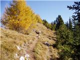 From the parking lot, we go on the road upwards to the signposts for Grlovec / Ferlacher Horn. Further, we continue on a cart track which is ascending by the stream upwards. Cart track then turns into a footpath which for some time is still ascending by the riverbed, and then turns left and steeply ascends. The path which is relatively steeply ascending, a little higher crosses a forest road. We further follow the path which is in parts a little poorly visible but well-marked. The path then brings us on the forest road which we follow few minutes to the spot, where the footpath branches off left upwards. The path ahead is at first steeply ascending, after that steepness decreases and the path brings us on an overgrown meadow after which we step on the road.