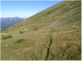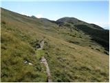 Here we continue right in the direction of Stol and Vajnež (left Struška and Golica) on the path which is further gently ascending on partly grassy and dwarf pined slopes. Next follows a short descent and the path brings us to the scree, which surround cirque Rida. Ahead in a gentle diagonal ascent we cross landslide slopes (in the main part on a short section danger of falling stones) and on the other side of Rida we ascend a level higher. Ahead steepness decreases and a more panoramic path brings us by the peak of almost unnoticeable Kamnitnik (1 minute). The path ahead in a gentle ascent crosses slopes towards the east and a little further it crosses a little more distinct gully.
