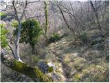 From the parking lot, we continue on a narrower asphalt road which is ascending towards the nearby church of the Holy Trinity. Right before we come to the church, the road splits into two parts. We continue on the bottom left marked road (on the right road in few steps we get to the already mentioned church, which is known after frescoes Mrtvaški ples), which starts descending through the village. Through the village we carefully follow the blazes, so that in crossroads we don't stray on the wrong path. After a few minute descent the road flattens, and we continue on a macadam road, from which beautiful views are opening up on Kraški rob. The road quickly brings us to a smaller crossroad below the power line, where we continue straight, or slightly left on a marked road. For some time we continue on the bottom of the valley, after that rough road crosses a stream and behind it turns slightly to the right and starts moderately ascending. A little higher worse road splits into two parts, and we go slightly left and we continue on a wider cart track, on which in few minutes of additional walking, we get to the underpass under the railway track.