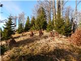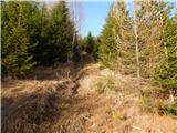 On the mentioned saddle there is the next crossroad of roads, and we continue straight, on a cart track which continues between the both roads. Quite overgrown cart track soon turns right, where it short time crosses slopes, and then it turns left upwards and steeply ascends to newer forest road. We continue on the road to the first left turn, which is situated on an indistinct ridge.