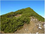 We continue on the path which starts ascending steeper on and by east ridge of Cjanovca. Higher, the path brings us out of the forest on slopes covered with dwarf pines, and we continue on steeper and in parts very panoramic path. The path, from which beautiful views are opening up on Kočna, Grintovec, Kalški greben and Gorenjska, is slowly turning slightly towards the left. This more and more panoramic and relatively steep path, we then follow all the way to the top of Cjanovca, on which stands bench and smaller cairn.