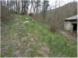 Soon after the church, at the last house in the village, the road ends and it changes into a cart track which turns right and starts moderately ascending through the forest. Cart track little higher starts ascending steeper and after a good half an hour of walking, it brings us on the forest road. After approximately 15 minutes of walking on the road, at smaller torrent we notice a blaze, which points us left upwards. Here follows some steep strides, and then we continue the ascent on a moderately steep forest path. The path which then becomes even more gentle at pleasant well brings us on the forest road which comes from the village Zamedveje. Further, we continue on the road which is slightly ascending and after few minutes of additional walking brings us to a smaller hamlet, where blazes point us to the left among houses upwards. The path ahead is moderately ascending, partly on a grassy slope, and partly through the forest. On the top of this ascent we come on an asphalt road, where we continue right, but only good 20 meters. And after 20 meters blazes point us to the left upwards, where in a diagonal ascent, over a grassy slope we ascend to the next road. We continue left on the road which turns right and goes into the forest. In the forest from the road, the path branches off to the left upwards towards the church of St. Genderca, here we continue on the road which again passes out of the forest on panoramic grassy slopes. Only a little further, we come to the parking lot, where a worse road branches off to the left upwards, which after 100 meters of walking, it brings us to the cottage on Korada.
