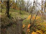 A little further, the path splits, and we continue on the right path in the direction of Sveti Socerb (left path leads on Kjecl, and from Kjecl it is possible to continue also on Sveti Socerb). The path ahead mostly continues through the forest, which is in the autumn adorned by the colors of a smoke tree. Higher, we reach the cart track which leads from the settlement Podraga towards Sveti Socerb, and we follow it to the left and then we immediately leave it because signs for Sveti Socerb point us to the right on a footpath. A little below the summit, we return on a cart track, and then we ascend there past the inscription box to the church of St. Servul, from which a nice view opens up towards Vipava valley and mountains which surround it.