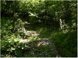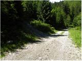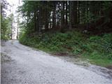From the trough we continue left, where at first through a smaller bridge we cross nearby stream and then we start moderately ascending by the edge of ample pasture. A little higher we cross a grazing fence, so that we pass over on inner side of the pasture. Further, we are ascending through an ample pasture, and the path mostly leads through very thin forest. Higher, we leave the pasture, and the path passes into a dense forest. Further, we cross a very rough cart track, after that for a short time, we are ascending by smaller torrent stream. The path ahead ascends to rough forest road, on which for some time we continue the ascent. When we get to a crossroad, where we join a wider macadam road (road which leads from Ravne towards the mountain pasture Storeča raven) we follow it to the left and there even descend a little (when we reach the road we don't continue straight on an ascending cart track, on which partly misleadingly points mountain signpost). After a short descent, marked cart track branches off to the right.