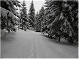From the parking lot, we continue on the road (in the winter time cross country ski trail) in the direction of the mountain hut Koča na Uskovnici. The road at first leads past a shooting range, and then passes into spruce forest, through which it continues to a smaller but marked crossroad. From the crossroad, we continue on the left bottom road (slightly right road which leads towards the starting point for mountain pasture Konjščica and Uskovnica access with a car), which is with a traffic sign closed for public traffic. On the road in few minutes we descend in a grassy valley Španove jame, and where after few minutes road splits into two parts.