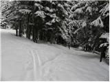 After the last huts the road ends or changes into a cart track which quickly leads into a dense forest. We continue on a marked cart track which continues through the forest, and it leads with some shorter ascents and descents. A well-marked path for some time continues through a dense forest and then descends to a forest road which we follow to the left (right Uskovnica and Rudno polje on the road).