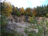 After the village, the path branches off to the left downwards towards the 20 minutes distant waterfall Kotel, and we continue straight, where the path or road leads past the quarry Zala. After the quarry, the road turns towards the east, where at first on the south side bypasses Preska (Preska is 805 meters high peak a little above the road), and then continues on and by the ridge of Debeli hrib.