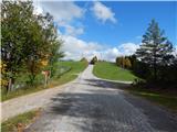 From the parking lot at the church of St. Vid we return to the main road, and from there we continue towards Osredek. Already after few 10 meters we get to a crossroad at the chapel, where we continue left in the direction of Osredek and only a little further at the unmarked crossroad we go again left. An asphalt road which continues without large changes in altitude or is even slightly descending, eventually brings us to the settlement Zala. Here at first a nice view opens up on surrounding hills, and then we walk past few more houses in the village.