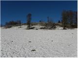From the inscription box, the path which runs on a worse road starts descending towards the valley of the stream Bolska. When we get to the mentioned valley, we step on a wider macadam road which we follow to the left. Further, we are ascending for some time through the mentioned valley, and then the road avoids it a little to the left. Further, we are ascending diagonally towards the right, meanwhile we cross a larger number of smaller streams and wells, which in dry days mostly dry up. Higher, we get to a marked crossroad, where we continue on the left wider macadam road, by which there are also signs for pasture "pašnik Lipovc". From the crossroad ahead, the road is only a short time ascending, and then it gradually starts gently descending and it brings us to the next crossroad.