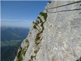 The climbing path already in the very beginning vertically ascends, and besides steel cables we get help also from some very small stemples (difficulty D). The path is for some time still almost vertically ascending by the steel cable (C), and then the path turns slightly to the left and in a gentle ascent crosses smooth plates (B). We go again to the right and we start ascending steeper by the steel cable (C) to the side ridge, which is partly covered with grass and dwarf pines. The path is then mostly ascending by the left side of the ridge (to B/C) and brings us on a little more vegetated terrain. For a short time, the path becomes a little less demanding (A, A/B), after that the ascent is again becoming gradually more demanding and is steeply ascending by the steel cable. On some spots, we also get help from a small stemples. Next follows a very demanding almost vertical ascent (C), which brings us to a grassy ledge. Here we continue right on the ledge (A), and then again left upwards into a vertical wall (C/D). Few times we very steeply ascend, and on some spots we get help from a stemple. The steepness then slightly decreases and ascent on smooth plates (B) brings us below an overhang.