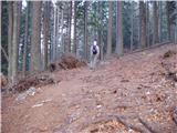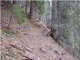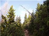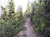 From the parking lot, we at first walk to a well Urbas, and here we notice a mountain sign for mountain pasture Belščica, which points us on at first a little harder to follow footpath. First 15 minutes of walking, the path only gently, and then it starts to ascend steeply through the forest. Higher the forest is becoming thinner and slowly passes into a lane of dwarf pines, and the path starts turning more and more towards the west. After a good hour of walking, we step on grassy slopes and the path after few additional strides, it brings us to bivouac on Belščica (emergency bivouac).