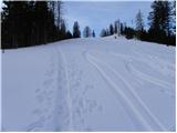 From the starting point, we at first walk to mountain pass Volovjek, and then at the crossroad we continue towards the east (direction Štajerski Rak and Kašna planina). The road which is further moderately ascending, quickly brings us to the inn Štajerski Rak, near of which we notice a large parking lot (option of starting point). We continue on the forest road which is further gently to moderately ascending through the forest. From the road which on the north side crosses slopes of Kranjska reber, occasionally a view opens up a little on Savinja side, where we can notice Ojstrica and plateau Dleskovška planota, and a little higher also Raduha. Eventually the road starts turning more and more to the right, where after few minutes of additional walking brings us on a smaller saddle Na Kalu.
