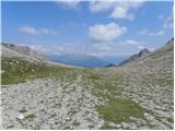 At the mountain hut where there is a marked crossing we continue right following the signs »Hallebachtörl, Spitzkofel«. The path further runs towards the southwest and is ascending on grassy slopes by rare larch forest. After approximately 20 minutes of walking from the mountain hut path brings us to another marked crossing.