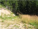 Above the farm Rezman, signposts for Stegovnik point us to the right on a wide ascending cart track which we then follow past transmitters to a marked crossing. We continue right in the direction of Stegovnik on a little narrower cart track which is further ascending diagonally on northeastern slopes of Bukovec. Higher, the path flattens, and then in a gentle descent brings us to a smaller abandoned mountain pasture, by the edge of which there is a hunting cottage.