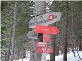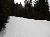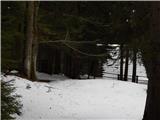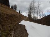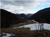 From the starting point by the water catchment we continue left by the stream Ljubija, where over a bad road is placed a green gate. After the gate we continue on a bad road which leads us through scenic gorge. In few minutes we get to relatively strong karst source, where stream Ljubija originates. From the source we continue on a worse and because of frequent rain quite rough road which continues through Ljubijski graben. Higher gorge splits into two parts, and we continue on the left gorge, by which still continues worse road. Further slopes by the path become less steep, and then we suddenly step on an ample meadow. The path continues by the left edge of a meadow, and then we join the wider macadam road which we follow to the left, or straight (right Dom na Smrekovcu - over Leskovškova pustota).